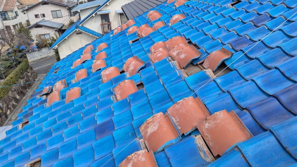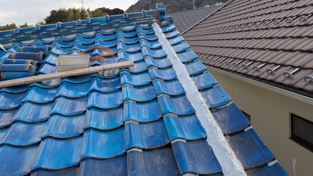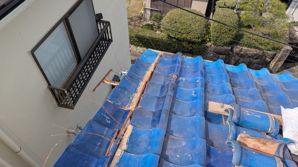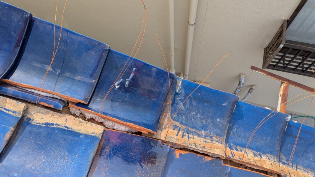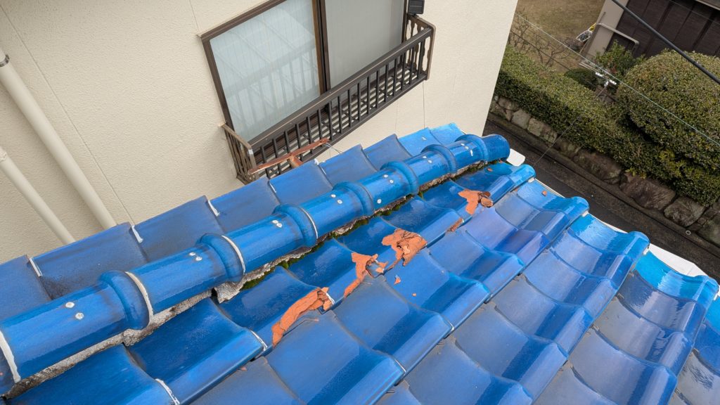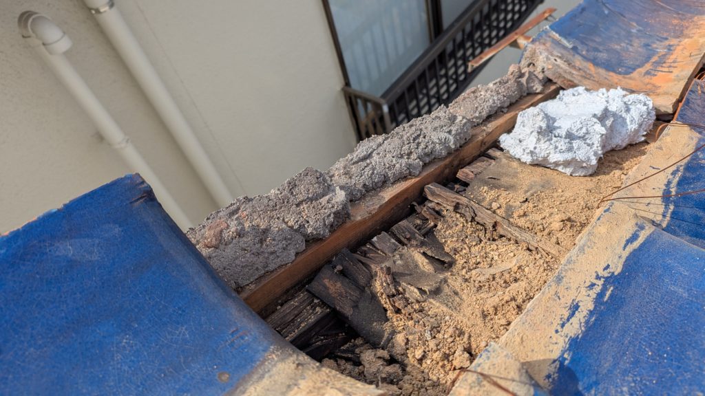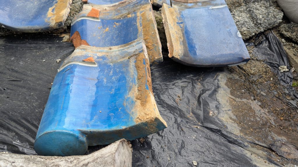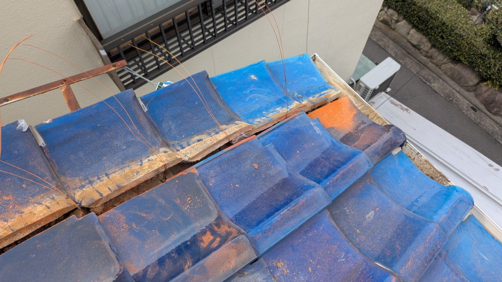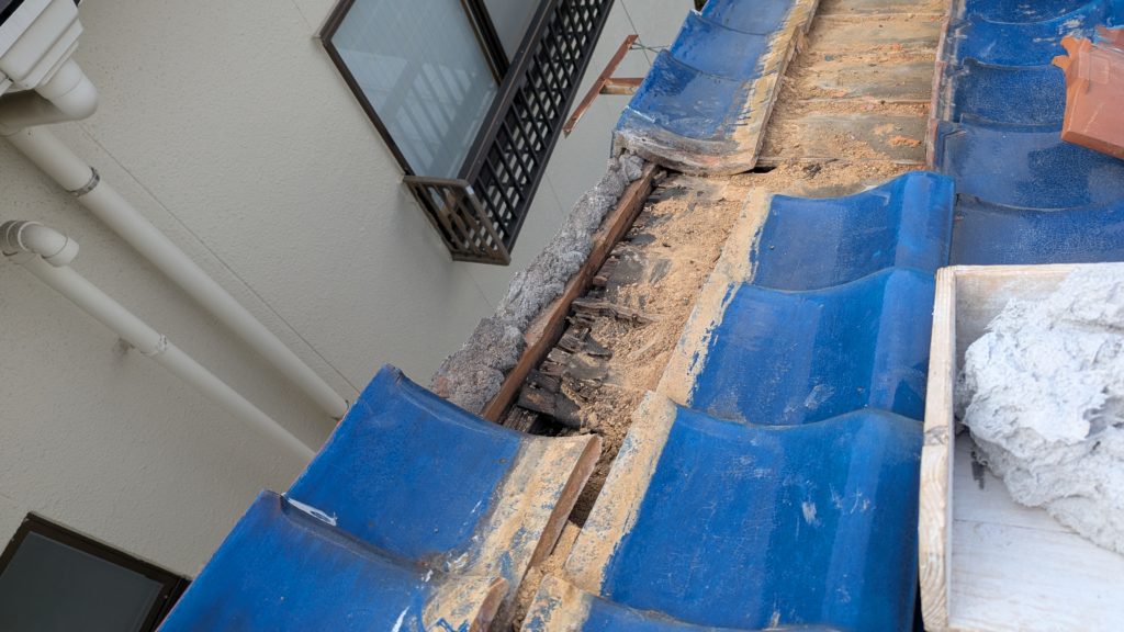 2026年3月3日現在。瓦の破片が瓦棒板金の上に落ちていることに気付かれ、見積り依頼をいただきました。 施主様も屋根に登り確認されたいとのことで、一緒に現状確認。 地瓦に水が染みて、ミルフィーユ状のささくれ割れになっている 色が濃い青緑色せいろくしょくの地瓦になっているところがあるため、一度修理をしているのがわかる 施主様も一緒に確認されたことで、即修理依頼をいただきました。 棟はコーキング処理されているが、点付コーキング処理のため、内部の劣化した赤土が隙間から雨を引っ張るため、棟を全列コーキングによるシーリング修理することで、今後の雨漏りの可能性を少なくする。今後10年くらいしたら邸宅を解体する予定のため、このような費用を抑えた修理を選ばれました。本当は崩して作り直す巻替えをした方がよいが、現状はそんなに悪くないため、シーリング修理が最適だと判断いたしました。 瓦棒板金の軒先が錆による腐食のため穴が空き、内部の屋根板が腐食している こちらも以前修理をしているが、雨の侵入を遮断しきれていないため、劣化が進んでいる 軒天井モルタルが染みてうたっているため、長年にわたり雨が侵入しているのがわかる 雨も入っており、なるべく早くの修理をご希望されました。一生懸命がんばりますのでよろしくお願い申し上げます。 2026年3月7日現在の工事です。施主様へ。施工写真をこのホームページへリアルタイムでアップ投稿していきますのでご確認、保存のほどよろしくお願いいたします。 赤いのはカットした粉がついているだけです。 新品瓦で差替えています。 中の屋根板にビスを打ち付け、そこにホルマル線を止め2本出すとんぼにしています。瓦を1枚1枚カットし隙間を狭くし、土で座りの角度を調整しています。 2026年3月7日現在の工事は以上です。明日もよろしくお願いいたします。 2026年3月8日現在の工事です。 瓦棒軒先板金加工