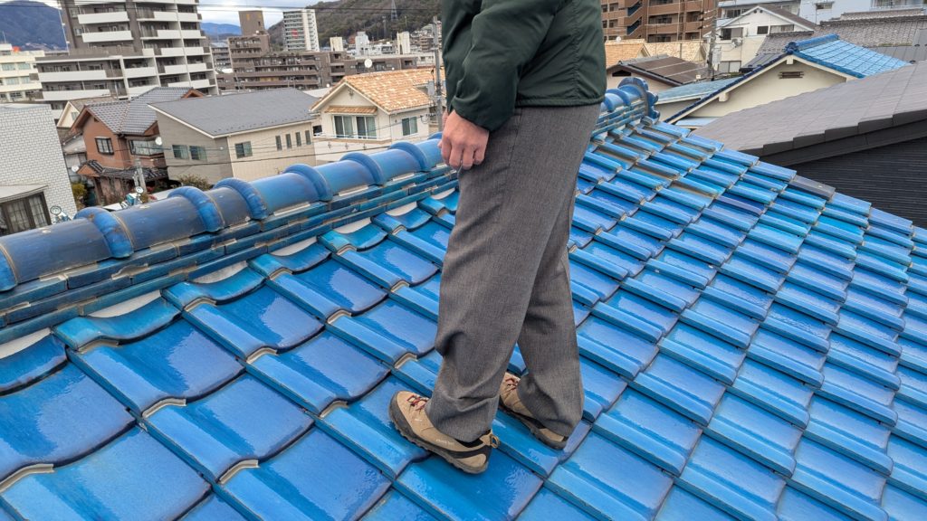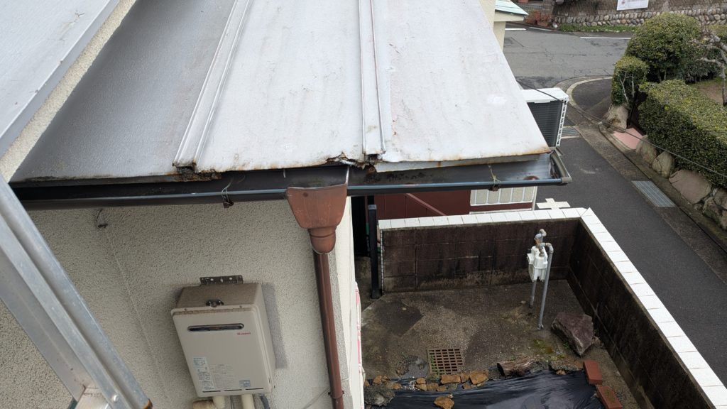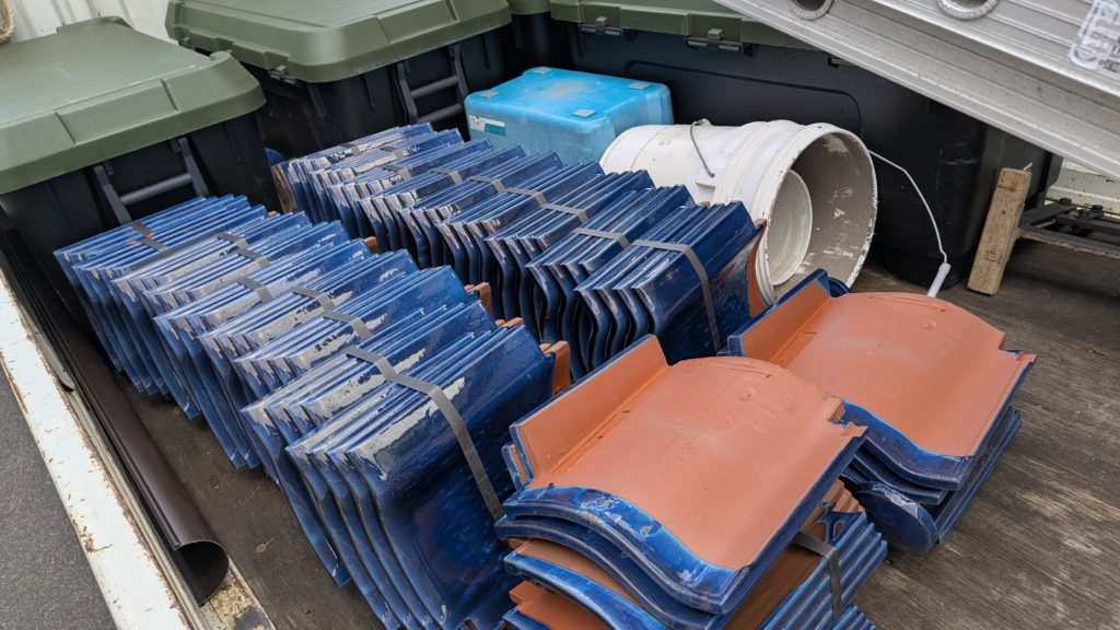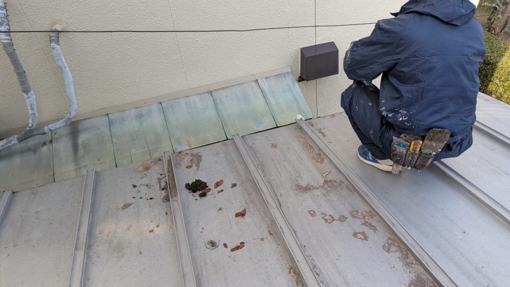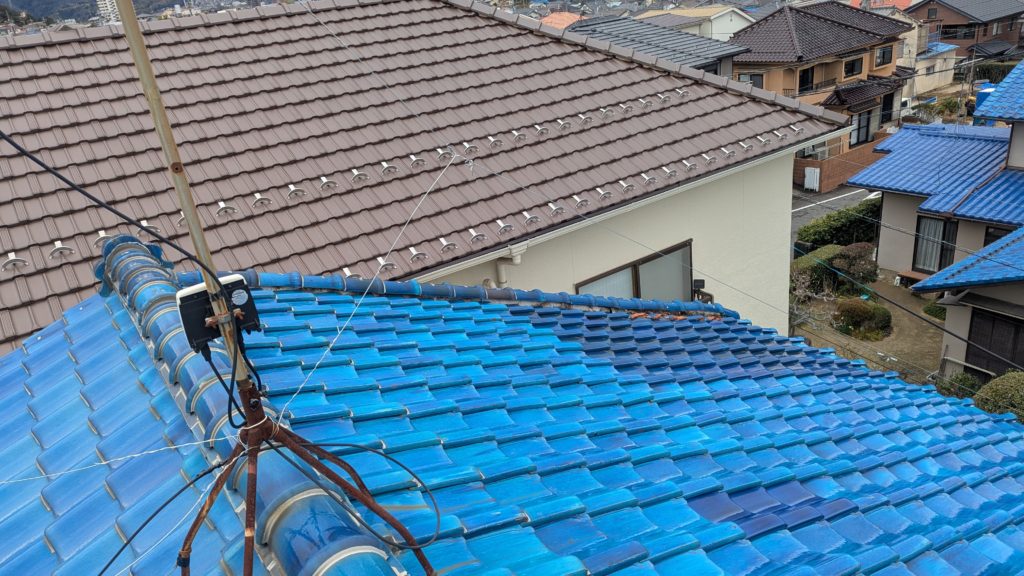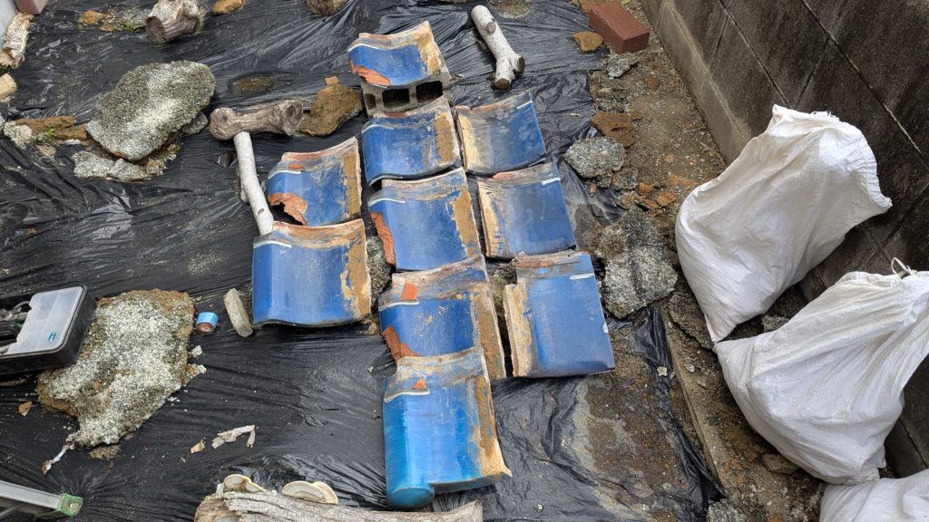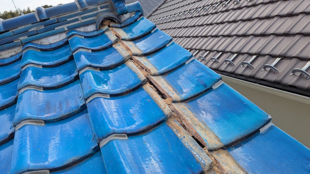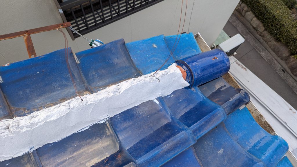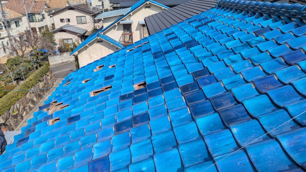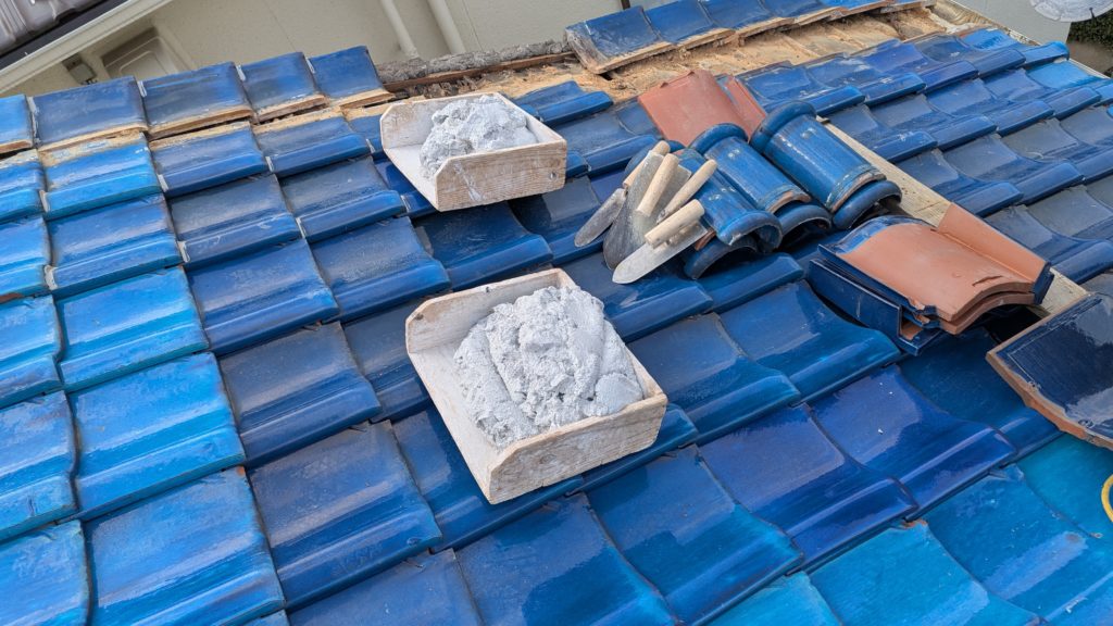 2026年3月3日現在。瓦の破片が瓦棒板金の上に落ちていることに気付かれ、見積り依頼をいただきました。 施主様も屋根に登り確認されたいとのことで、一緒に現状確認。 地瓦に水が染みて、ミルフィーユ状のささくれ割れになっている 色が濃い青緑色せいろくしょくの地瓦になっているところがあるため、一度修理をしているのがわかる 施主様も一緒に確認されたことで、即修理依頼をいただきました。 棟はコーキング処理されているが、点付コーキング処理のため、内部の劣化した赤土が隙間から雨を引っ張るため、棟を全列コーキングによるシーリング修理することで、今後の雨漏りの可能性を少なくする。今後10年くらいしたら邸宅を解体する予定のため、このような費用を抑えた修理を選ばれました。本当は崩して作り直す巻替えをした方がよいが、現状はそんなに悪くないため、シーリング修理が最適だと判断いたしました。 瓦棒板金の軒先が錆による腐食のため穴が空き、内部の屋根板が腐食している こちらも以前修理をしているが、雨の侵入を遮断しきれていないため、劣化が進んでいる 軒天井モルタルが染みてうたっているため、長年にわたり雨が侵入しているのがわかる 雨も入っており、なるべく早くの修理をご希望されました。一生懸命がんばりますのでよろしくお願い申し上げます。 2026年3月7日現在の工事です。施主様へ。施工写真をこのホームページへリアルタイムでアップ投稿していきますのでご確認、保存のほどよろしくお願いいたします。 赤いのはカットした粉がついているだけです。 新品瓦で差替えています。 中の屋根板にビスを打ち付け、そこにホルマル線を止め2本出すとんぼにしています。瓦を1枚1枚カットし隙間を狭くし、土で座りの角度を調整しています。 2026年3月7日現在の工事は以上です。明日もよろしくお願いいたします。 2026年3月8日現在の工事です。 瓦棒軒先板金加工