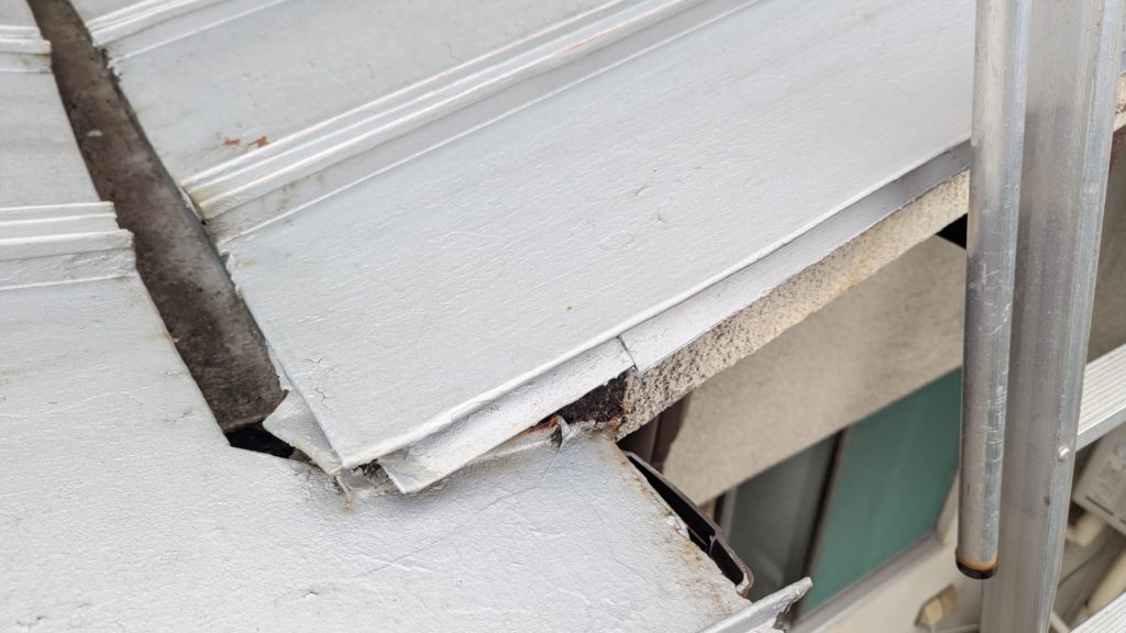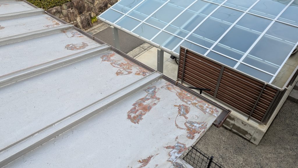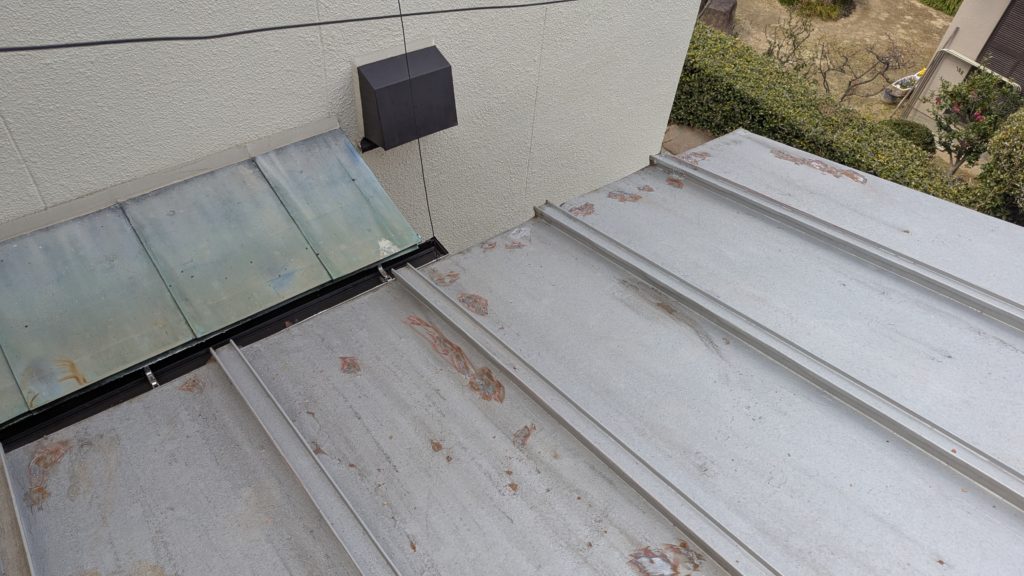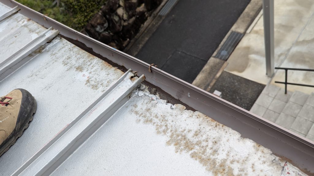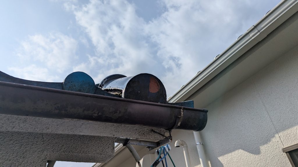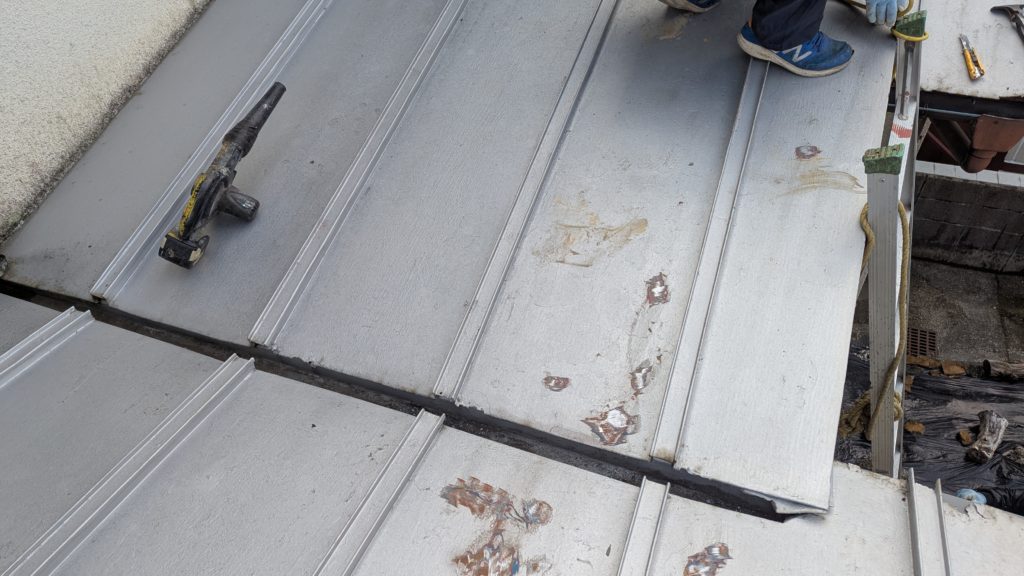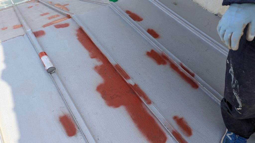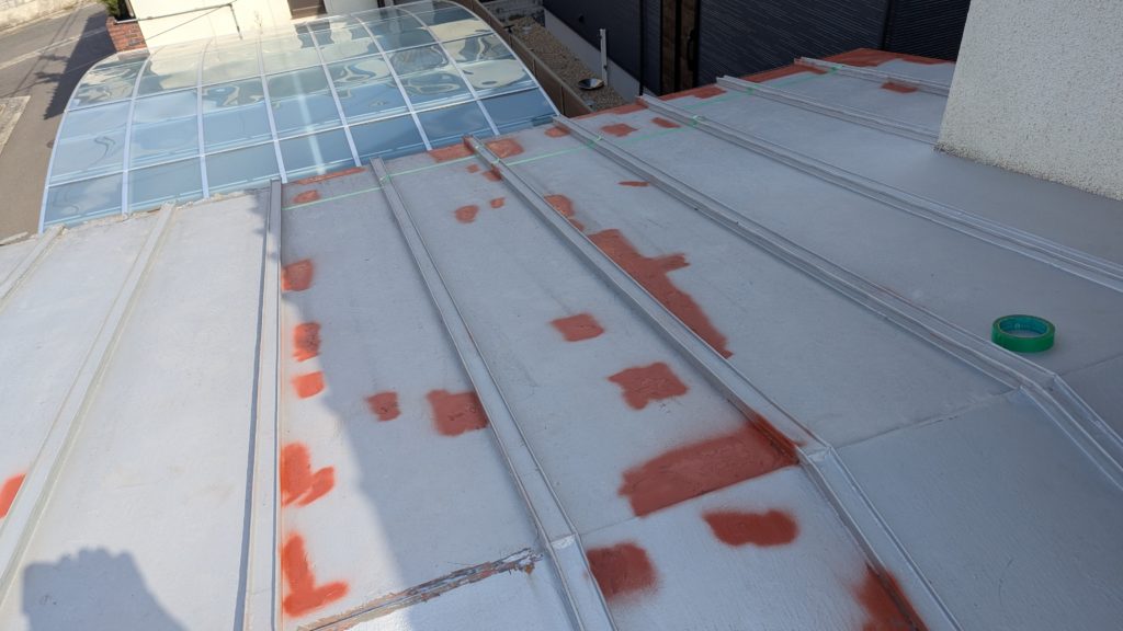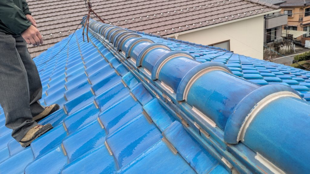 2026年3月3日現在。瓦の破片が瓦棒板金の上に落ちていることに気付かれ、見積り依頼をいただきました。 施主様も屋根に登り確認されたいとのことで、一緒に現状確認。 地瓦に水が染みて、ミルフィーユ状のささくれ割れになっている 色が濃い青緑色せいろくしょくの地瓦になっているところがあるため、一度修理をしているのがわかる 施主様も一緒に確認されたことで、即修理依頼をいただきました。 棟はコーキング処理されているが、点付コーキング処理のため、内部の劣化した赤土が隙間から雨を引っ張るため、棟を全列コーキングによるシーリング修理することで、今後の雨漏りの可能性を少なくする。今後10年くらいしたら邸宅を解体する予定のため、このような費用を抑えた修理を選ばれました。本当は崩して作り直す巻替えをした方がよいが、現状はそんなに悪くないため、シーリング修理が最適だと判断いたしました。 瓦棒板金の軒先が錆による腐食のため穴が空き、内部の屋根板が腐食している こちらも以前修理をしているが、雨の侵入を遮断しきれていないため、劣化が進んでいる 軒天井モルタルが染みてうたっているため、長年にわたり雨が侵入しているのがわかる 雨も入っており、なるべく早くの修理をご希望されました。一生懸命がんばりますのでよろしくお願い申し上げます。 2026年3月7日現在の工事です。施主様へ。施工写真をこのホームページへリアルタイムでアップ投稿していきますのでご確認、保存のほどよろしくお願いいたします。 赤いのはカットした粉がついているだけです。 新品瓦で差替えています。 中の屋根板にビスを打ち付け、そこにホルマル線を止め2本出すとんぼにしています。瓦を1枚1枚カットし隙間を狭くし、土で座りの角度を調整しています。 2026年3月7日現在の工事は以上です。明日もよろしくお願いいたします。 2026年3月8日現在の工事です。 瓦棒軒先板金加工