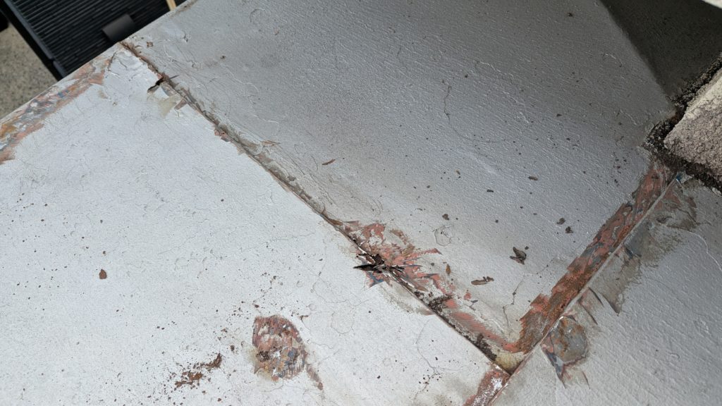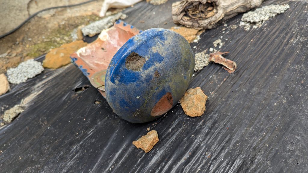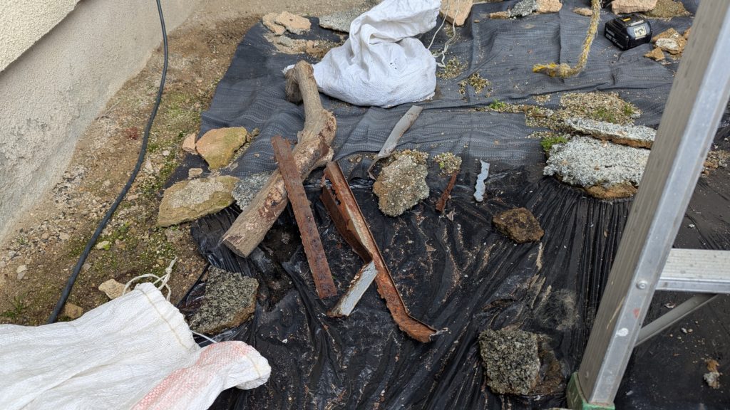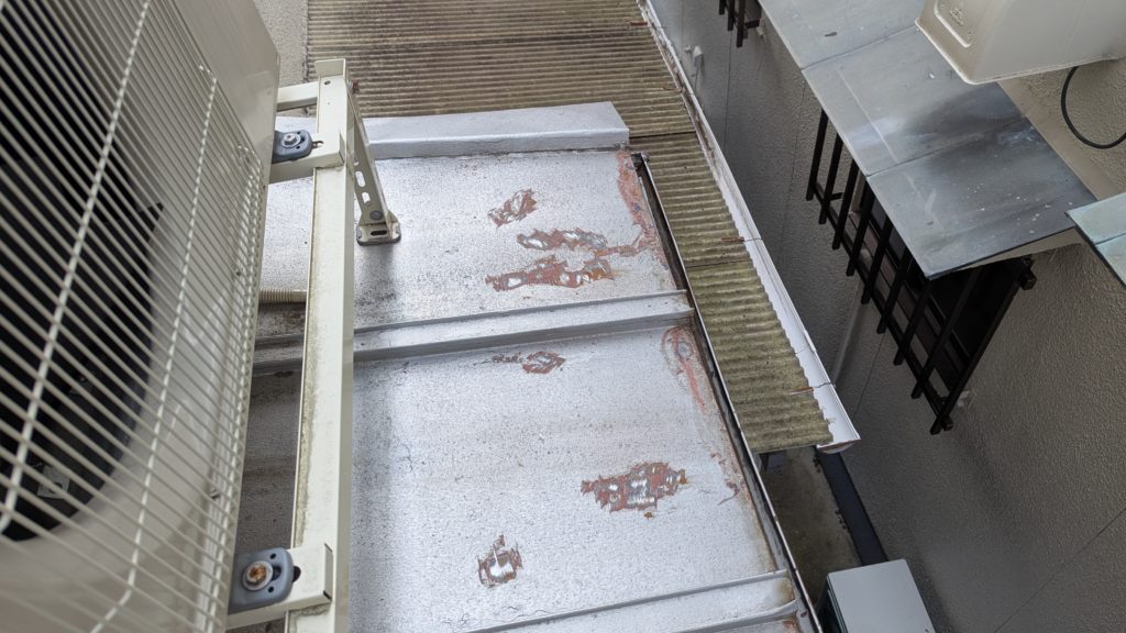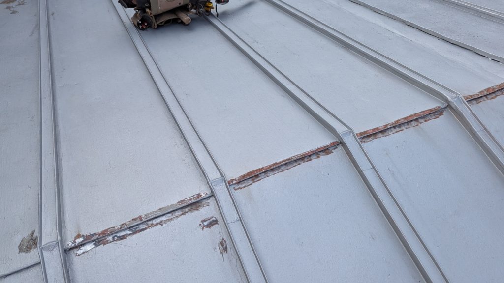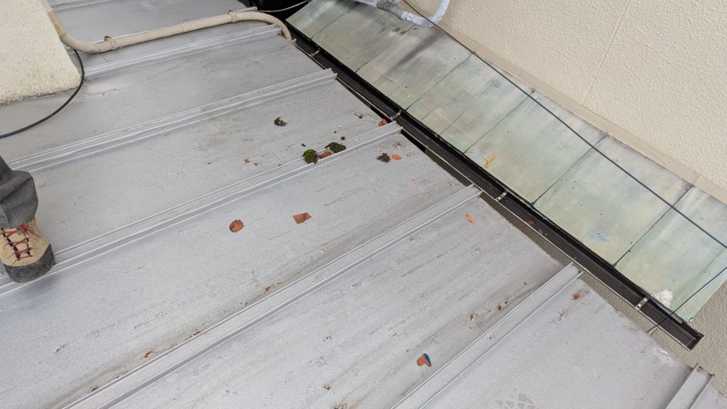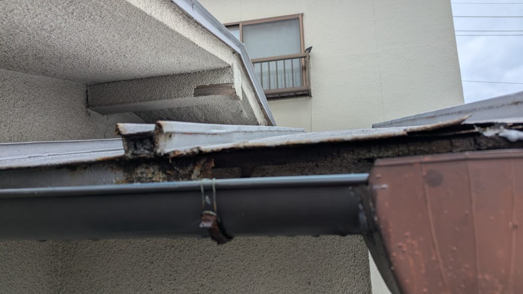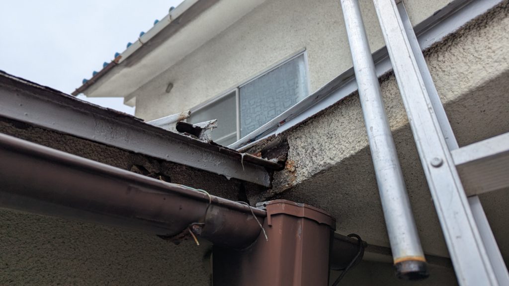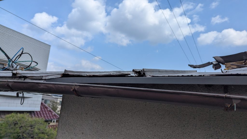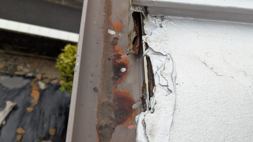 2026年3月3日現在。瓦の破片が瓦棒板金の上に落ちていることに気付かれ、見積り依頼をいただきました。 施主様も屋根に登り確認されたいとのことで、一緒に現状確認。 地瓦に水が染みて、ミルフィーユ状のささくれ割れになっている 色が濃い青緑色せいろくしょくの地瓦になっているところがあるため、一度修理をしているのがわかる 施主様も一緒に確認されたことで、即修理依頼をいただきました。 棟はコーキング処理されているが、点付コーキング処理のため、内部の劣化した赤土が隙間から雨を引っ張るため、棟を全列コーキングによるシーリング修理することで、今後の雨漏りの可能性を少なくする。今後10年くらいしたら邸宅を解体する予定のため、このような費用を抑えた修理を選ばれました。本当は崩して作り直す巻替えをした方がよいが、現状はそんなに悪くないため、シーリング修理が最適だと判断いたしました。 瓦棒板金の軒先が錆による腐食のため穴が空き、内部の屋根板が腐食している こちらも以前修理をしているが、雨の侵入を遮断しきれていないため、劣化が進んでいる 軒天井モルタルが染みてうたっているため、長年にわたり雨が侵入しているのがわかる 雨も入っており、なるべく早くの修理をご希望されました。一生懸命がんばりますのでよろしくお願い申し上げます。 2026年3月7日現在の工事です。施主様へ。施工写真をこのホームページへリアルタイムでアップ投稿していきますのでご確認、保存のほどよろしくお願いいたします。 赤いのはカットした粉がついているだけです。 新品瓦で差替えています。 中の屋根板にビスを打ち付け、そこにホルマル線を止め2本出すとんぼにしています。瓦を1枚1枚カットし隙間を狭くし、土で座りの角度を調整しています。 2026年3月7日現在の工事は以上です。明日もよろしくお願いいたします。 2026年3月8日現在の工事です。 瓦棒軒先板金加工