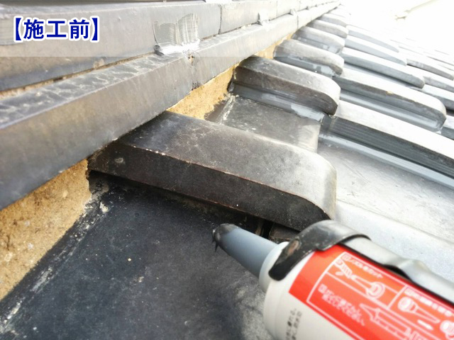 瓦の差し替え、平瓦の浮きを調整し、隙間をコーキングで埋めます。